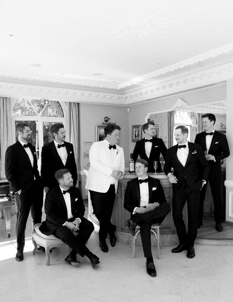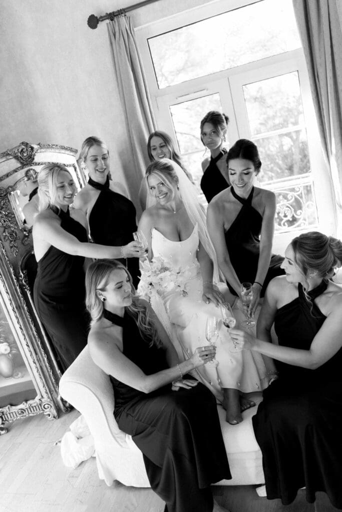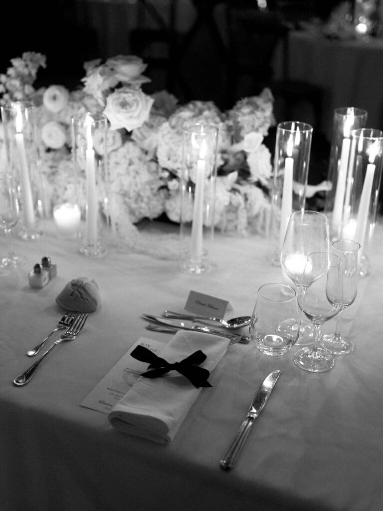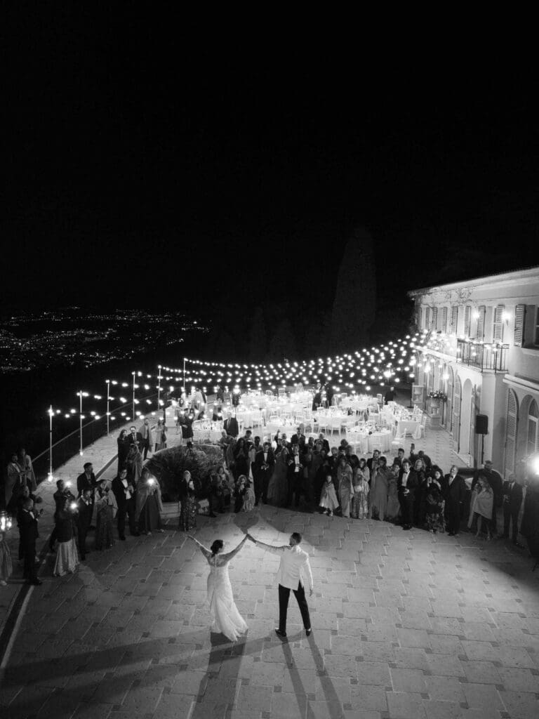 After dinner, the mood shifted entirely. The black and white photographs from the dance floor tell that story best: guests crowded together, arms raised, completely present in the moment. The same people who had been composed and elegant at the ceremony were now entirely free.