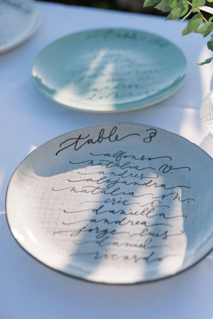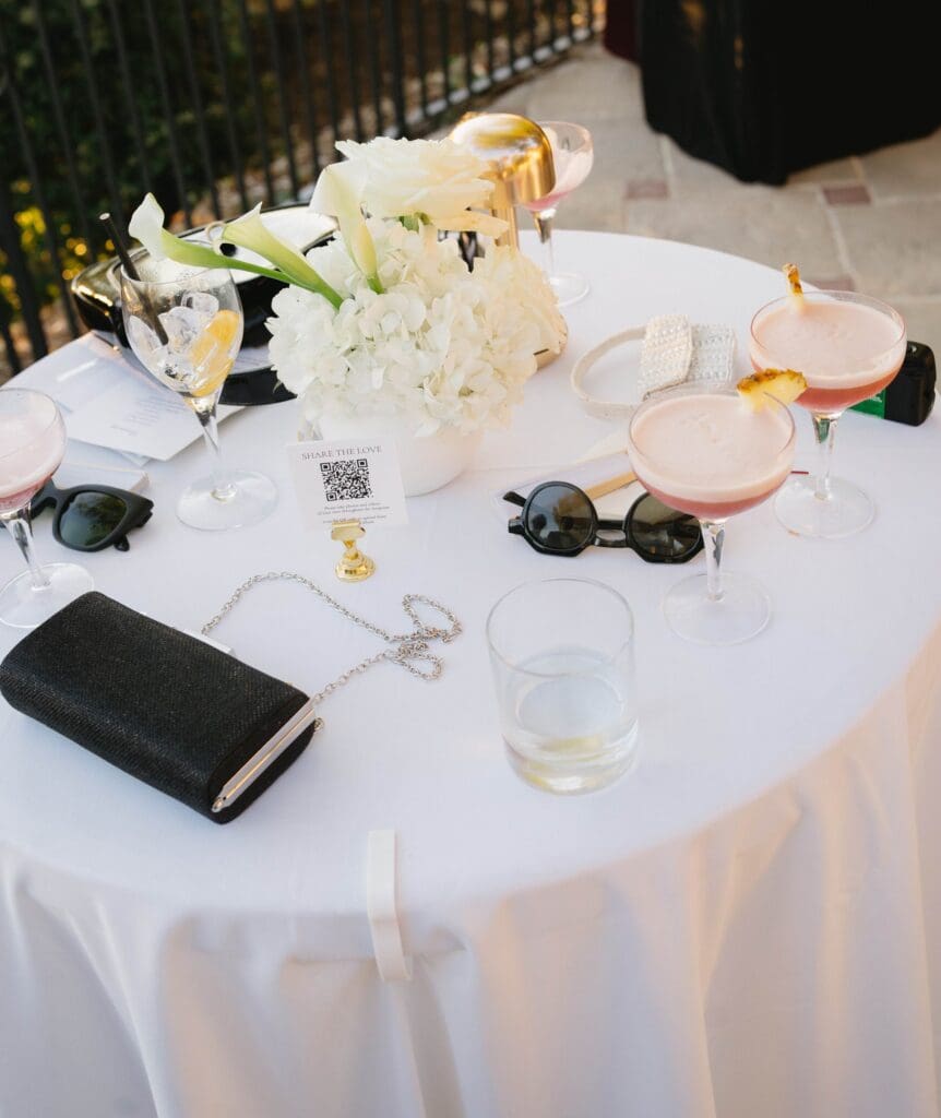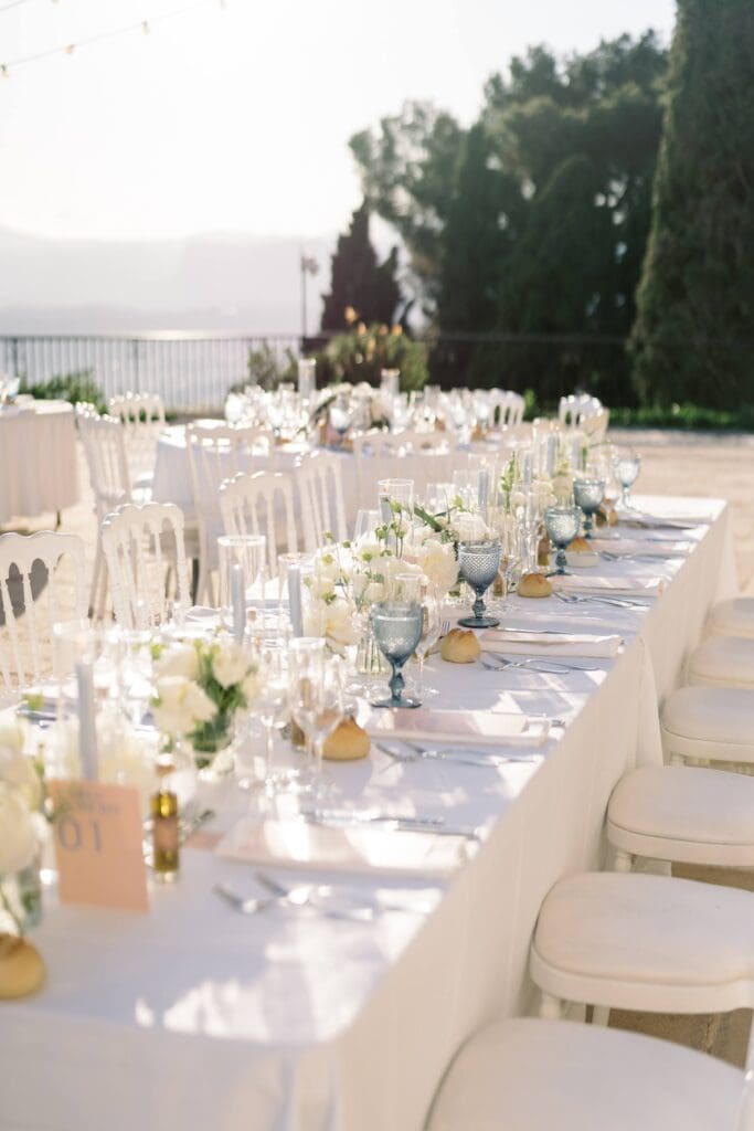 The reception at Kim and Gabe’s wedding remains one of the most beautifully designed I have planned. Round tables ran along the terrace with the sea and sky as their backdrop. The florals were architectural — white blooms and structured greenery, precisely arranged. Each place setting featured custom engraved glassware in a smoky blue that caught the fading light beautifully.