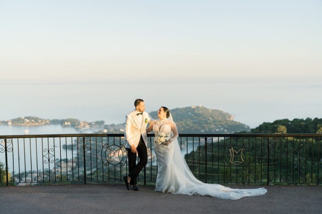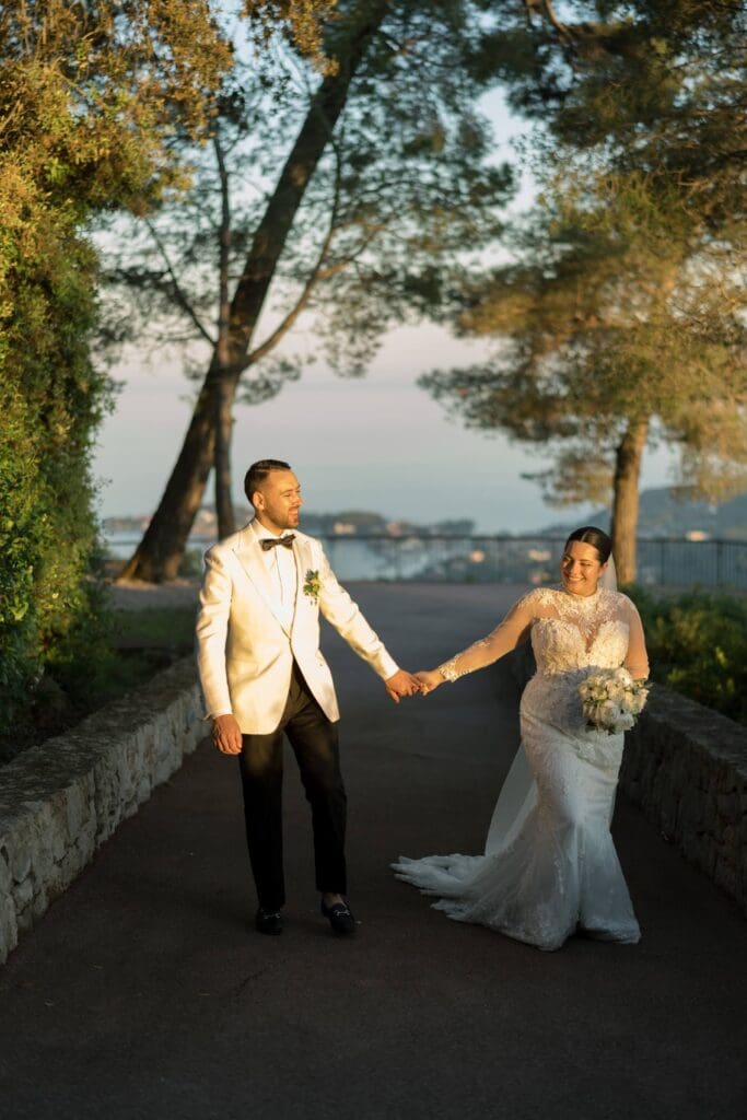 For Kim and Gabe, the arrival at the Domaine after the church felt like a second entrance. Guests were already gathered, the setting was at its most beautiful in the early evening light, and the couple stepped into it fresh from their vows. That transition — from the intimacy of the church to the scale of the landscape above Monaco — was a moment in itself.