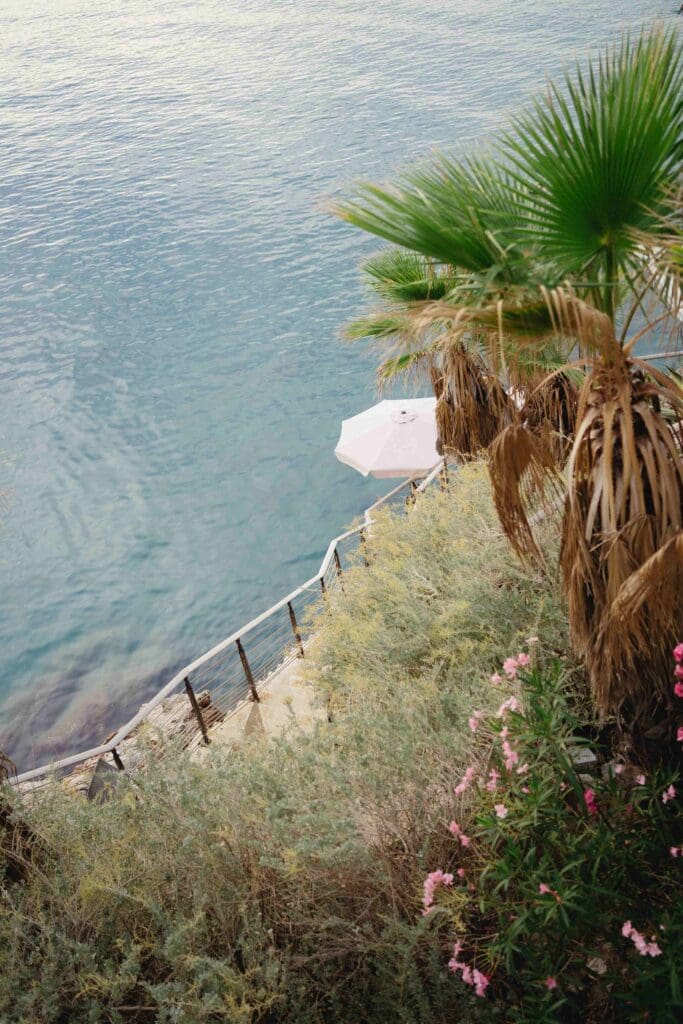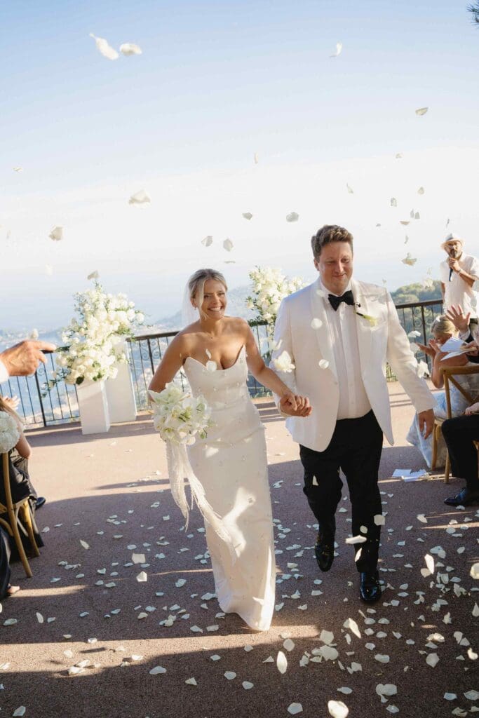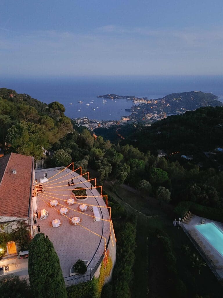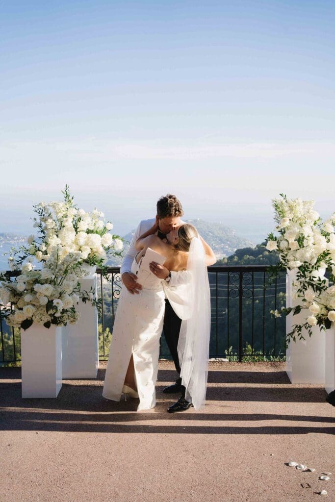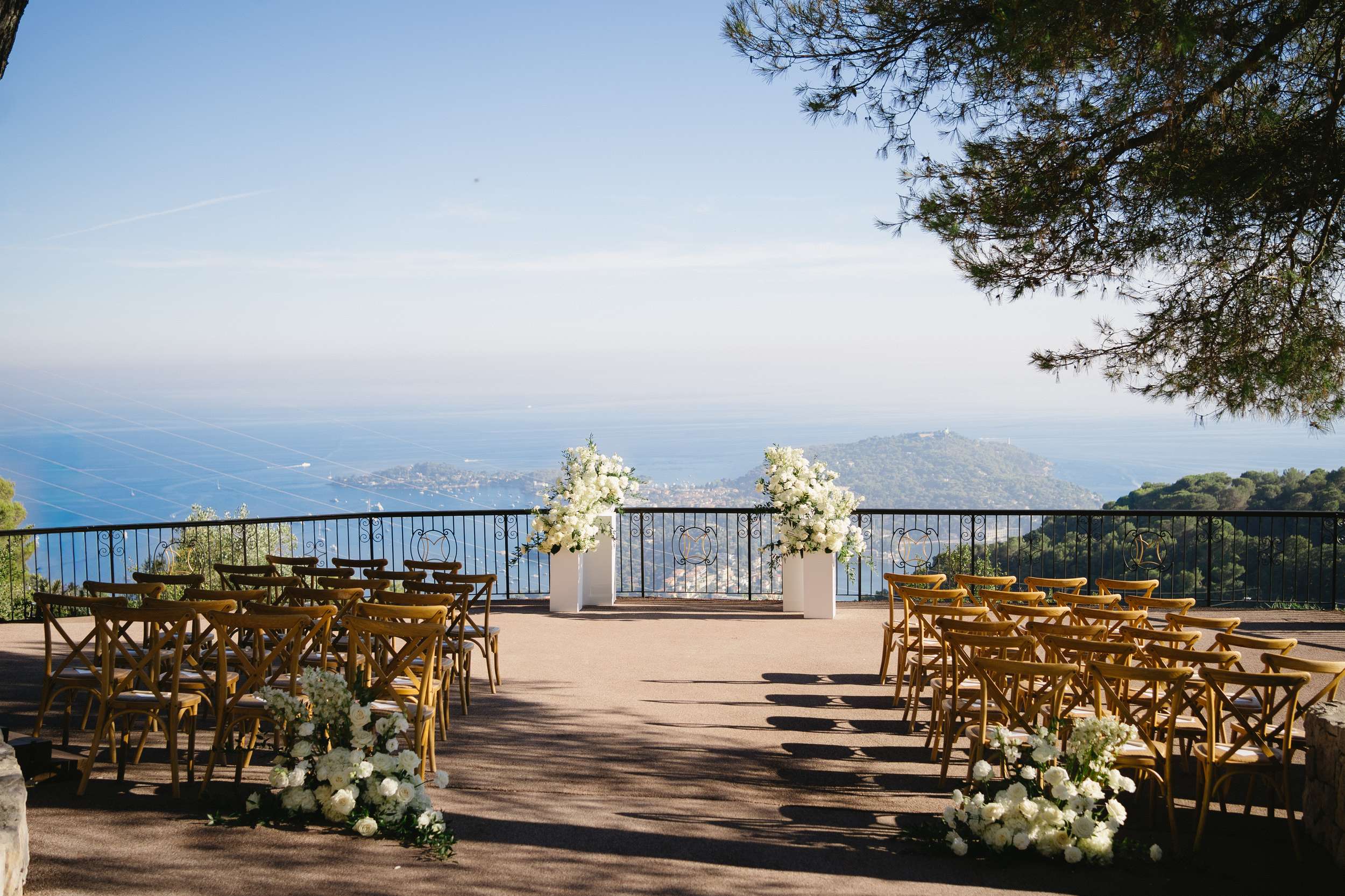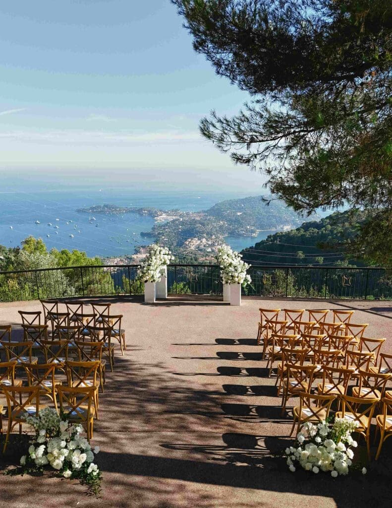 The ceremony took place outdoors, on a terrace facing directly toward Villefranche-sur-mer, Monaco and the sea. Wooden chairs lined either side of the aisle. White florals framed the ceremony structure. And beyond it all — the view.